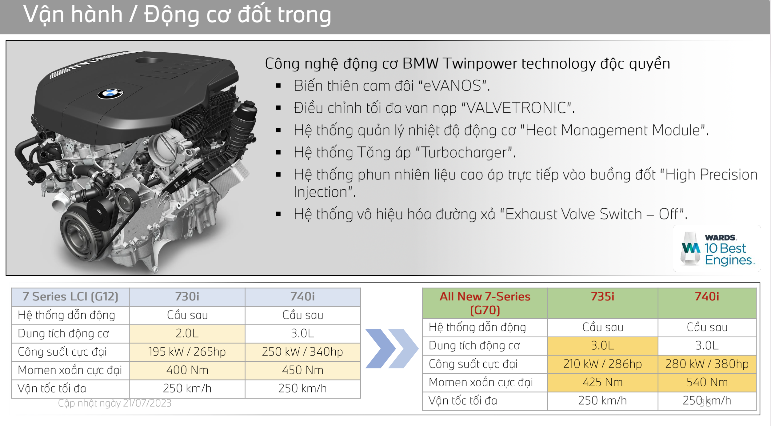 Tất cả phiên bản BMW 7 Series hoàn toàn mới được ra mắt tại Việt Nam đều sở hữu động cơ 6 xi-lanh thẳng hàng kết hợp với công nghệ Mild Hybrid 48V. Ở phiên bản BMW 735i sản sinh công suất 286 mã lực, mô-men xoắn 425Nm và có thể tăng tốc từ 0 – 100 km/h chỉ trong 6,7 giây trong khi phiên bản BMW 740i đạt công suất lên đến 381 mã lực, mô – men xoắn 540 Nm và chỉ mất 5,4s để tăng tốc từ 0 – 100 km/h.